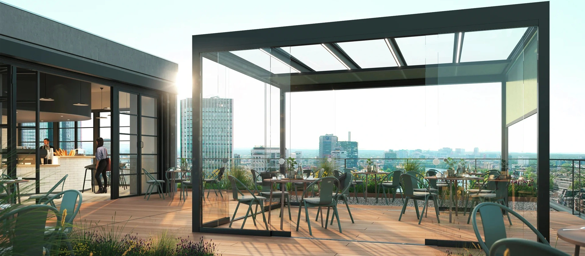 Das Glasdach ist komplett wasserdicht und von oben kann kein Wasser an die Möbel gelangen. Zusätzlich bieten Zusatzelemente für die Seiten noch mehr Wetterschutz.