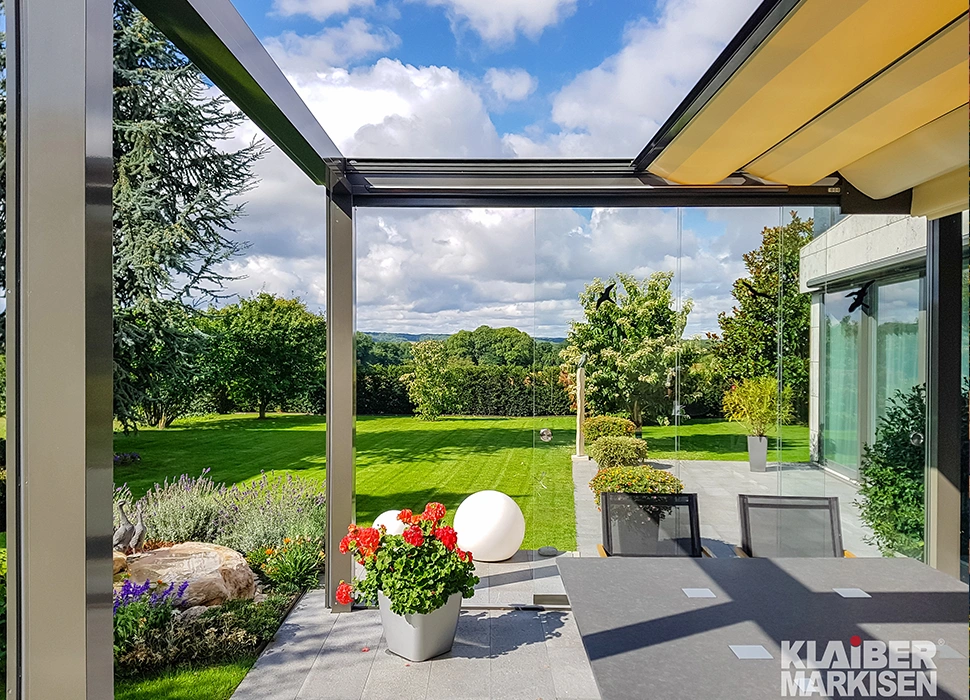 Das Glasdach ist komplett wasserdicht und von oben kann kein Wasser an die Möbel gelangen. Zusätzlich bieten Zusatzelemente für die Seiten noch mehr Wetterschutz.